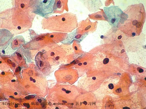 显示许多细胞胞浆呈橘黄色,核增大,核浆比轻度增高,核大小及形状轻度异常, 核轻至中度深染,染色质分布均匀。核轮廓光滑、规则。可见双核细胞。