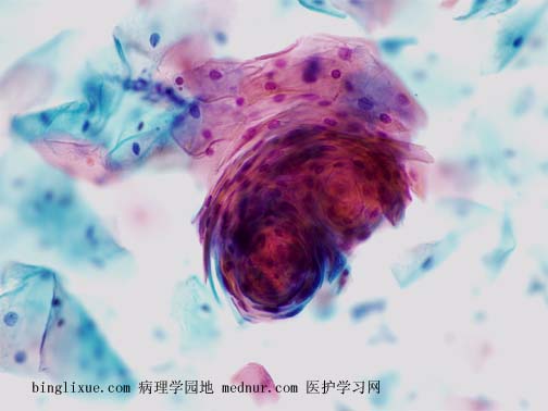 上图(非典型鳞状细胞意义不明确、液基涂片): 显示许多细胞(角化不良细胞)胞浆呈橘黄色,核轻度增大,形成角化珠。