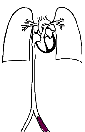 Atherosclerosis may weaken the wall of the aorta such that it bulges out to form an aneurysm. An atherosclerotic aortic aneurysm typically occurs in the abdominal portion below the renal arteries, as shown here. Aortic aneurysms that get bigger than 6 or 7 cm are likely to rupture. 动脉粥样硬化处的动脉壁变得很薄弱,容易膨出形成动脉廇。图示:肾动脉以下的腹主动脉廇。大动脉廇的直径大于6到7cm时很容易引起破裂。 |