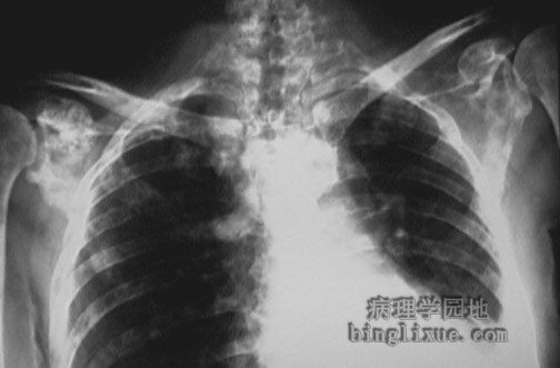胸部X线显示,乳腺癌转移病人,胸部骨质溶解破坏。 This chest radiograph demonstrates osteolytic metastases in a patient with metastatic breast carcinoma. Chest, osteolytic metastases |