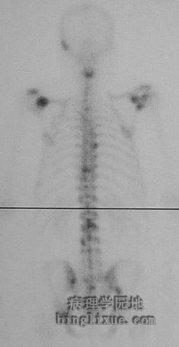 核素扫描显示多个病灶,脊柱周围颜色较深的病灶代表转移性病变。 This nuclear medicine bone scan reveals multiple areas of increased uptake, which are the darker foci, such as in the vertebral column representing metastases. |