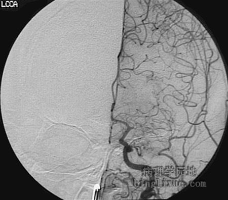 血管造影显示左颈总动脉的主要分支的栓子阻塞。