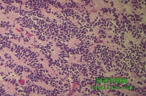 髓母细胞瘤显微镜图像,肿瘤细胞是蓝色、圆型小细胞。 Here is the microscopic appearance of a medulloblastoma with small round blue cells. |