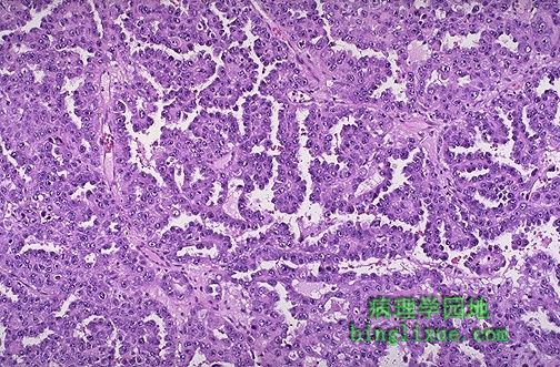 甲状腺乳头状癌组织学外观。乳头分枝多,乳头中心有薄层纤维血管间质。再没有其它肿瘤与乳头状腺瘤结构相同,并且所有的甲状腺乳头状瘤都应以恶性看待。 This is the microscopic appearance of a papillary carcinoma of the thyroid. The fronds of tissue have thin fibrovascular cores. The fronds have an overal papillary pattern. There is no such thing as a papillary adenoma, and all papillary neoplasms of the thyroid should be considered malignant. |