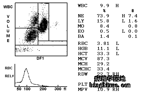 全血细胞计数提示球形红细胞增多症,其红细胞小而圆(而不是正常的双面平凹外观),且血红蛋白含量增加。从MCHC(红细胞平均血红蛋白浓度)升高可见。这是极少见的遗传性球形红细胞增多症。 This CBC demonstrates findings suggestive of spherocytosis, a condition in which the RBC's are small and round (rather than the normal biconcave appearance) with increased hemoglobin content. This is indicated here by the increase MCHC (mean corpuscular hemoglobin concentration). There is a rare condition known as hereditary spherocytosis. Also, RBC's in the condition of autoimmune hemolytic anemia can also appear similarly. |