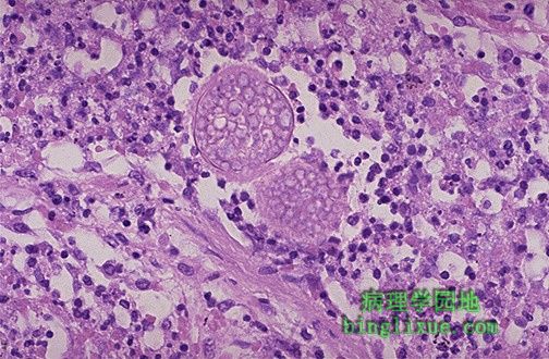 粗球孢子菌病肺部感染灶,可见两个大球体充满内生孢子。 This pulmonary infection is due to Coccidioidomycosis, as evidenced by the two large spherules filled with endospores. |