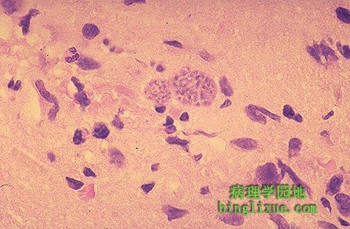艾滋病患者脑组织病理解剖显示小胶质细胞结节内可见刚地弓形虫假孢囊,同时伴有各种炎细胞浸润。 A brain biopsy reveals cysts of Toxoplasma gondii in a microglial nodule with a variety of inflammatory cell types in a patient with AIDS. |