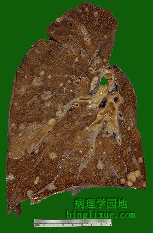 可见肺表面散大的多个大小不一的肿块。灰白色结节状肿块是转移癌的特征。肺转移瘤比原发性肺肿瘤更常见,因为许多其它原发肿瘤可通过血道转移到肺。甚至图示的肺门的结节也是转移癌的结节。瘤结节通常出现在边缘,阻塞作用小。 Multiple variably-sized masses are seen in all lung fields. These tan-white nodules are characteristic for metastatic carcinoma. Metastases to the lungs are more common even than primary lung neoplasms simply because so many other primary tumors can metastasize to the lungs. Even the hilar nodes in this photograph demonstrate nodules of metastatic carcinoma. The nodules are usually in the periphery and do not cause major obstruction. |