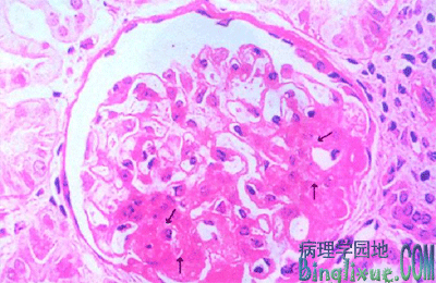 光镜下肾小球表现为局灶性节段性系膜增生,纤维素样坏死,或硬化。增生性病变轻微且可自发消退,极少数情况下形成节段性瘢痕。坏死性病变,初期多为节段性毛细血管纤维素样坏死,血栓形成,并可刺激肾小囊壁上皮细胞增生,形成新月体,最后导致节段性瘢痕形成和肾小囊粘连,而肾小球其他部分结构保存良好。这种硬化性病变为非进行性,通常不影响肾功能。