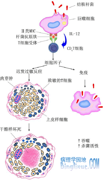 结核病的病原菌是结核分枝杆菌(Mycobacterium tuberculosis),主要是人型和牛型。人型结核杆菌感染的发病率最高。临床上所指的结核病多由上述两型引起。结核病主要经呼吸道传染,也可经消化道感染,少数经皮肤伤口感染。 呼吸道传播是最常见和最重要的途径。肺结核病人(主要是空洞型肺结核)从呼吸道排出大量带菌微滴。吸入这些带菌微滴即可造成感染。直径小于5μm的微滴能到达肺泡,因此其致病性最强。到达肺泡的结核杆菌趋化和吸引巨噬细胞,并为巨噬细胞所吞噬。在有效细胞免疫建立以前,巨噬细胞将其杀灭的能力很有限,结核杆菌在细胞内繁殖,一方面可引起局部炎症,另一方面可发生全身性血源性播散,成为以后肺外结核病发生的根源。机体对结核杆菌产生特异的细胞免疫一般需30-50天时间。这种特异的细胞免疫在临床上表现为皮肤结核菌素试验阳性,其具体过程见图。